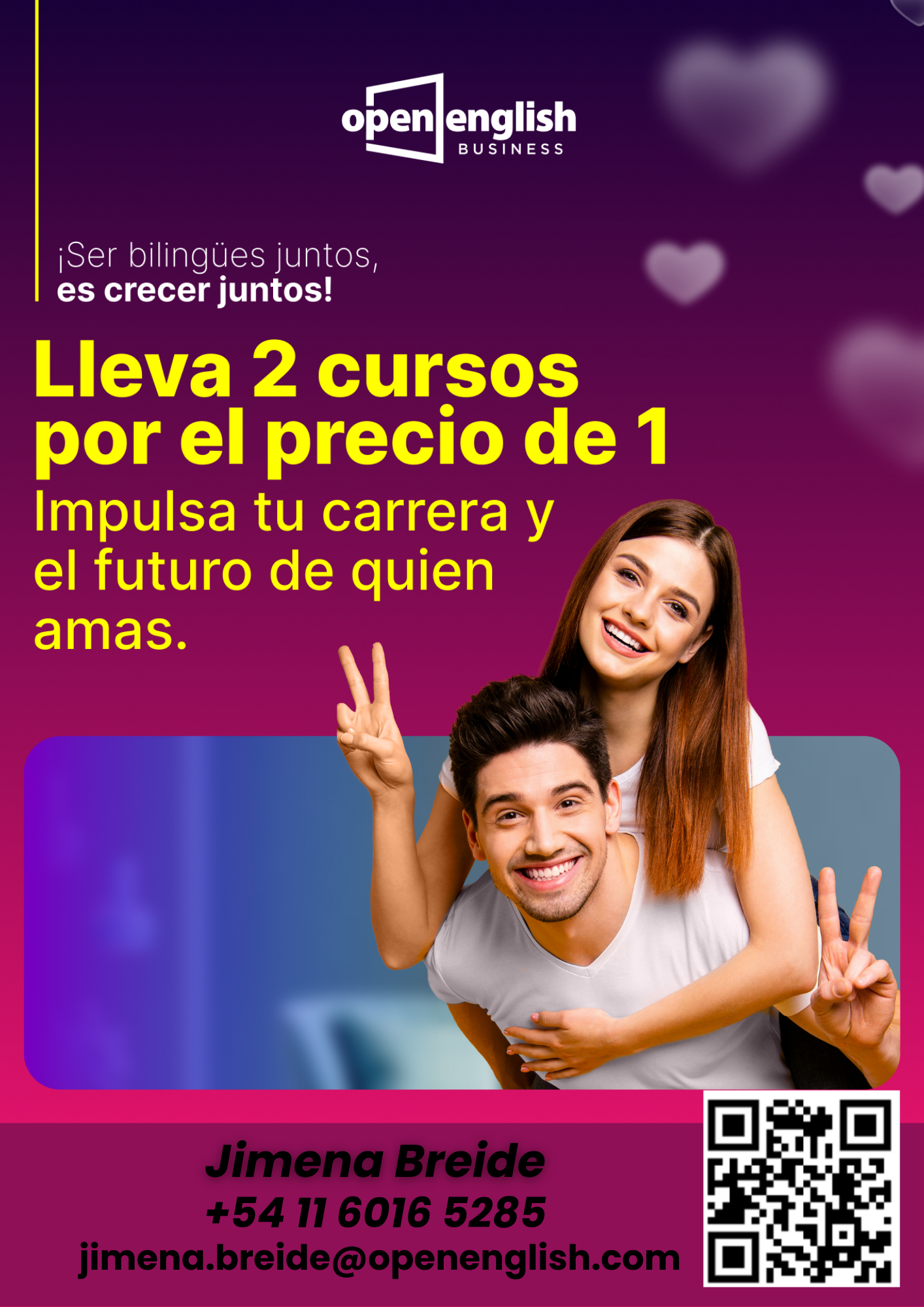Para acceder al descuento o consultar sobre las propuestas de Open English, ppdes contactarte con Jimena Breide al Whatsapp +5411 6016 5285 o por mail jimena.breide@openenglish.com